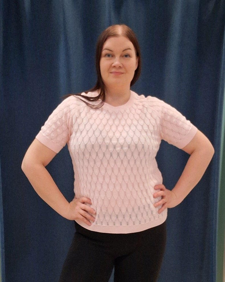 Kaunis ohuempi neulepusero T-paita hihalla. Lehtimäinen reikäneulos kuviointi. Tyköistuva malli. Hiha raglan-mallia.