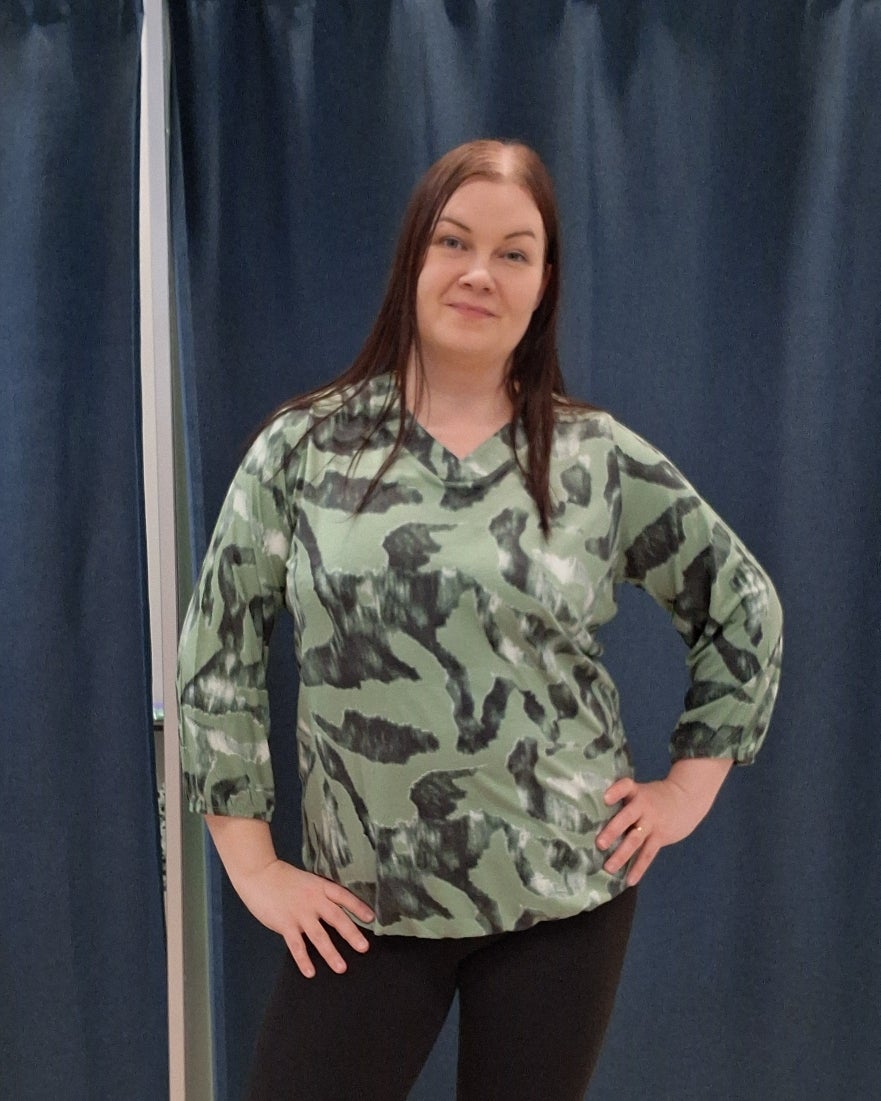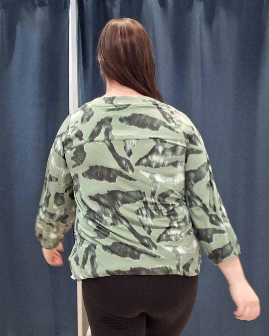 Pehmeä ja joustava viskoosi pusero. V-pääntie. Helmassa ja hihansuissa kuminauha. 3/4 hihat.
